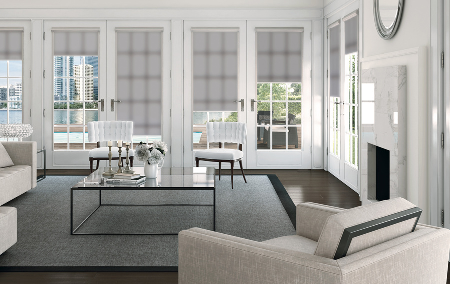 Les stores enrouleurs permettent de combiner un tissu décoratif et un tissu technique dans un même système pour gérer la lumière de la pièce à tout moment, d’un environnement à lumière filtrée jusqu’à une opacité totale.
