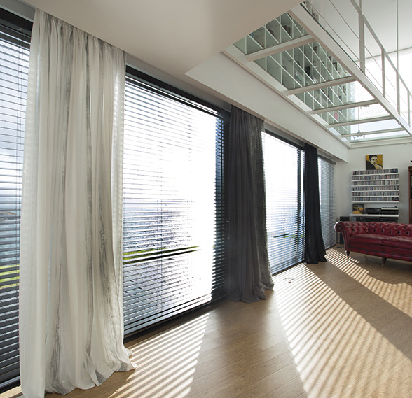 Le store vénitien est un choix pratique et fonctionnel pour un contrôle élevé et précis du passage de la lumière. Grâce à sa structure en lames de différentes largeurs orientables à 180° sur leur axe horizontal, ce système associe la clarté d’une ouverture totale et la capacité d’obtenir une grande opacité dans sa position dépliée. Disponible en lames d’aluminium inoxydable, ce qui en fait une solution idéale pour les environnements humides et salins, ou en lames de bois pour une finition exclusive qui met en valeur l’esthétique du cadre de vie et le rend plus accueillant.